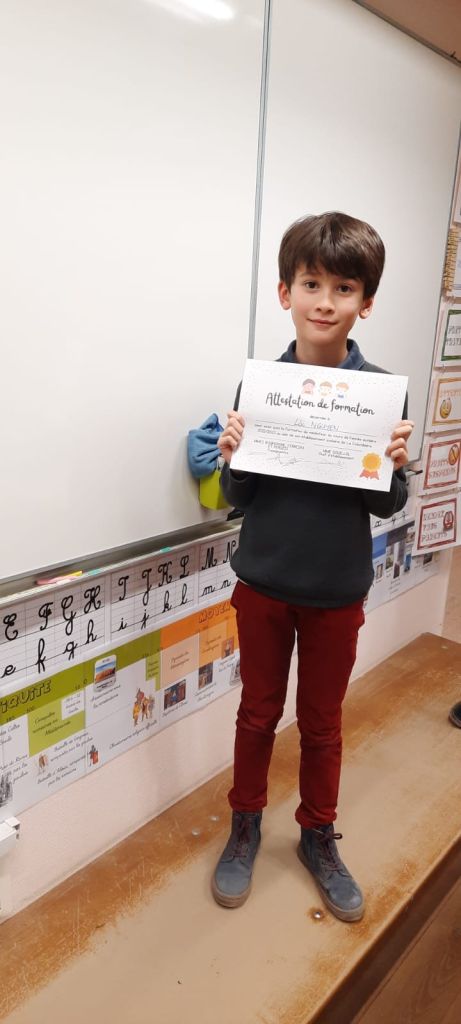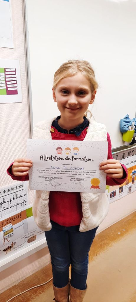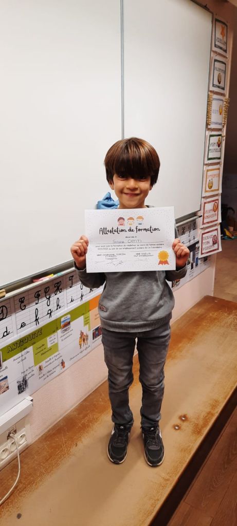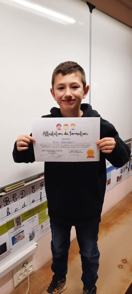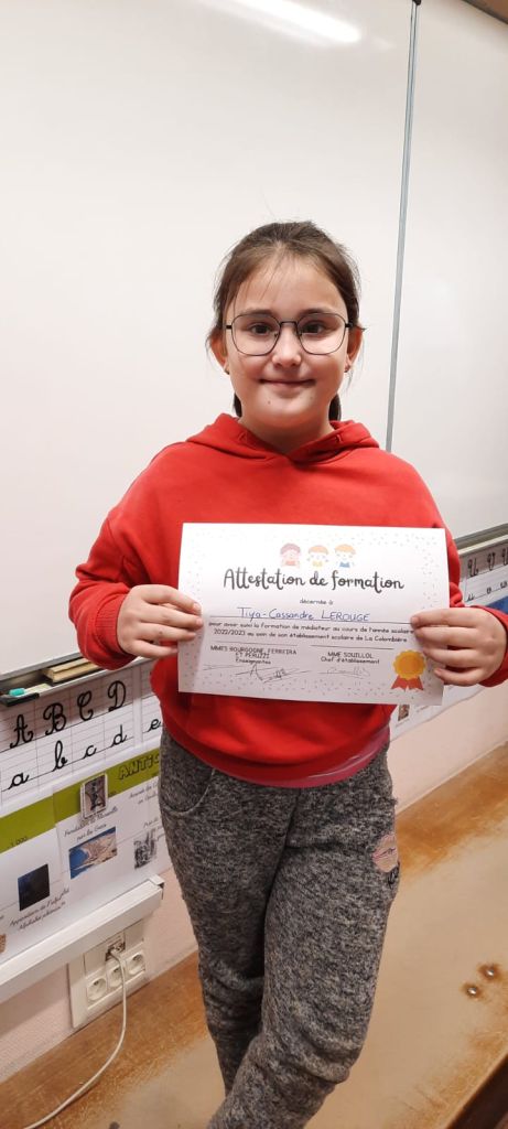 Lors de la dernière séance de ce mardi 13 décembre, chaque élève s'est vu remettre un diplôme d'attestation de formation. Ils pourront être médiateurs à tour de rôle sur les temps de récréation dès qu’ils passeront en CM2 voire en fin de CM1. Ils participeront à la résolution des conflits entre élèves et permettront d'améliorer le dialogue entre élèves et éventuellement de repérer des situations graves.